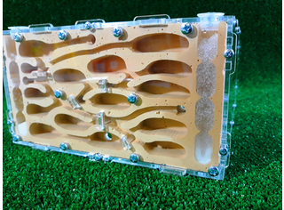 Гнездо муравьиной фермы обрамлено со всех сторон акрилом для исключения излишнего испарения влаги. Для автономного увлажнения предусмотрено две камеры увлажнения, заполненные гидрогелем, который служит как барьером при излишнем увлажнении, так и буфером, удерживающим влагу при недостатке влажности.